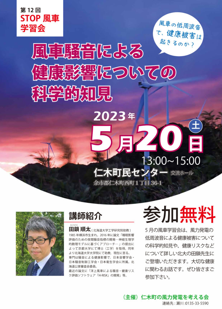 仁木町の風力発電を考える会です。 一見エコと思われる風力発電ですが、住民の健康被害にもかかわる、とても多くの問題を抱えています。 いっしょに学んでいきましょう。