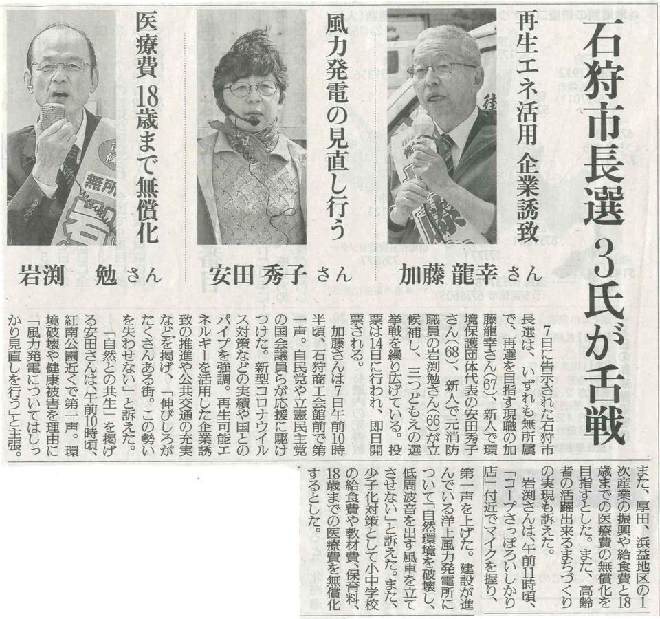 再エネ推進派の現職市長と反対派の安田秀子さんの戦い、超党派で、これ以上の風車を石狩湾に立てさせてはいけません。