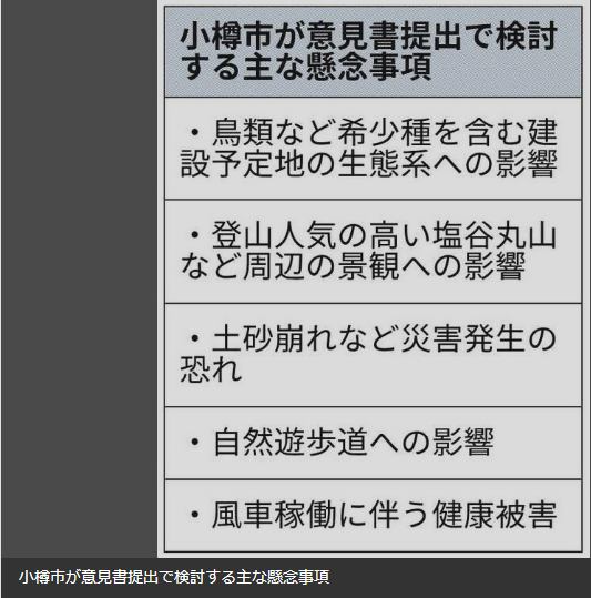 『小樽市、風力発電事業に反対 景観悪化、災害リスク懸念 余市町も意見書提出へ』
