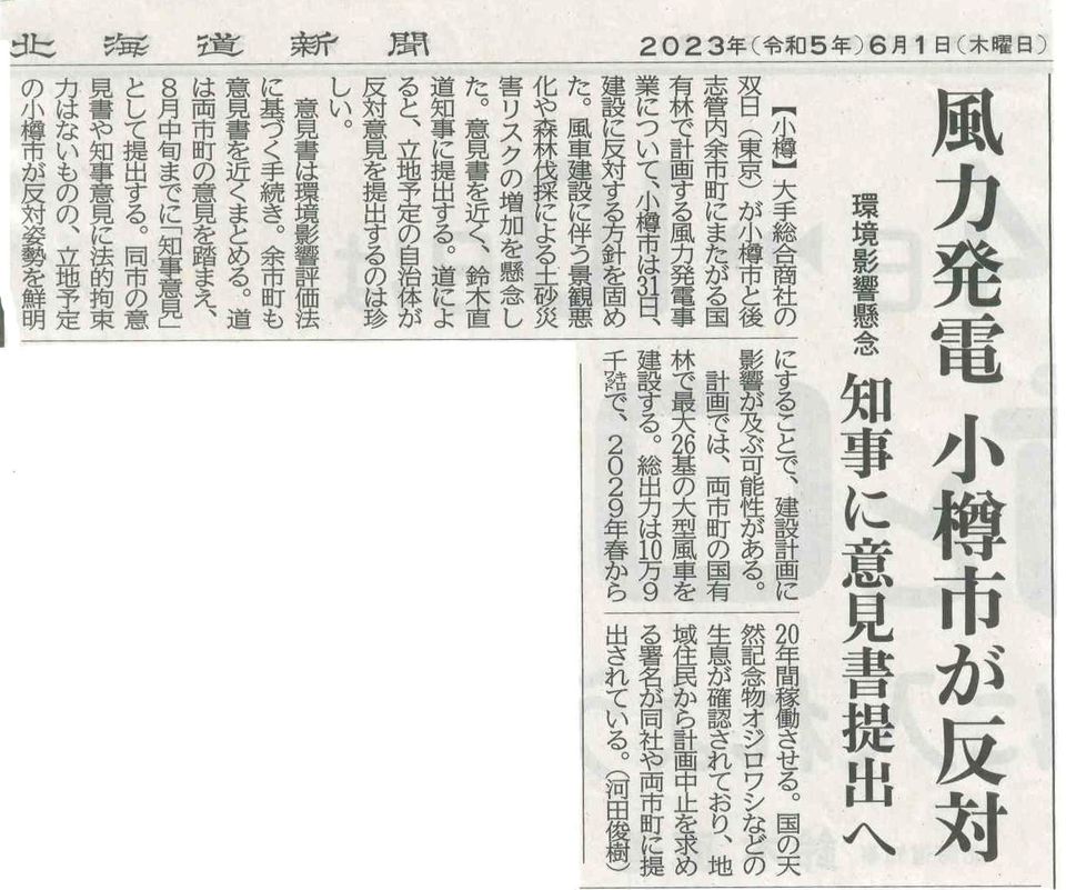 21年4月には住民有志が「小樽余市の巨大風力発電から自然と生活を守る会」を結成し、計画中止を求める署名活動を展開し、約1万筆を集めていた。