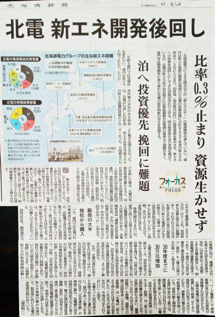 16日、道新に「北電新エネ開発後回し・・・・・」とあります。