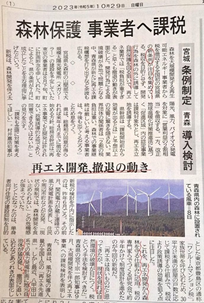 2023.11.05 無秩序な開発に待った! 森林保護へ向け再エネ課税 日本の話題 以下転載。 山地 弘純 6日 · 森林の外への誘導。 無秩序な開発に待った! 「森林保護 事業者へ課税」 宮城-条例制定、青森-導入検討 (2023年10月29日付 秋田魁新報) #新温泉町いのちをつむぐ会 #新温泉風力発電計画ストップへ向けて #兵庫県でも条例制定したい Tweet Share Hatena Pocket RSS feedly Pin it この記事のタイトルとURLをコピーする 「オーステッド、米国で洋上風力計画中止 6千億円を減損」 前の記事 「潤うのは中国と一部業者」ー北海道に林立する巨大風車は誰のためになるのかー 次の記事 niki-wind 仁木町の風力発電を考える会です。 一見エコと思われる風力発電ですが、住民の健康被害にもかかわる、とても多くの問題を抱えています。 いっしょに学んでいきましょう。 http://niki-wind.main.jp/
