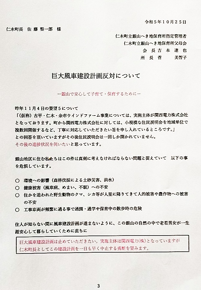 「銀山へき地保育所父母会」必死の反対風車建設の要望書を非情にも無視。