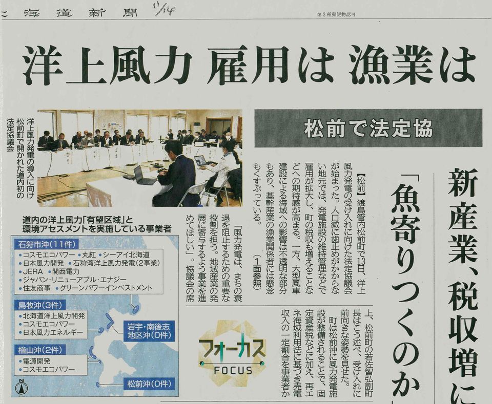 【松前】渡島管内松前町沖で受け入れ計画が進む洋上風力発電事業について、国、道、漁業関係者らが意見を調整する法定協議会の初会合が13日、松前町内で開かれた。