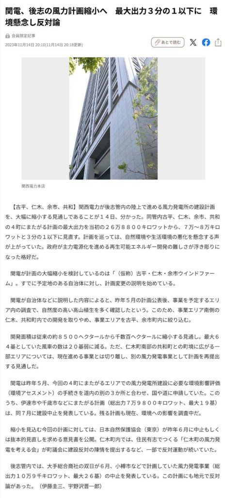 関西電力が後志管内の陸上で進める風力発電所の建設計画を、大幅に縮小する見通しであることが14日、分かった。