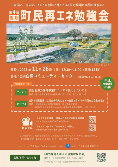 2023.11.22 26日(日)、当別町でも、再エネ勉強会があります 北海道の話題 近隣の方々、どうぞお誘いの上、ご参加くださいませ。 Tweet Share Hatena Pocket RSS feedly Pin it この記事のタイトルとURLをコピーする 新しく【古平・余市ウインドファーム事業】計画、関電発表! 前の記事 関西電力 「方法書」HP上で閲覧可能 次の記事 niki-wind 仁木町の風力発電を考える会です。 一見エコと思われる風力発電ですが、住民の健康被害にもかかわる、とても多くの問題を抱えています。 いっしょに学んでいきましょう。 http://niki-wind.main.jp/