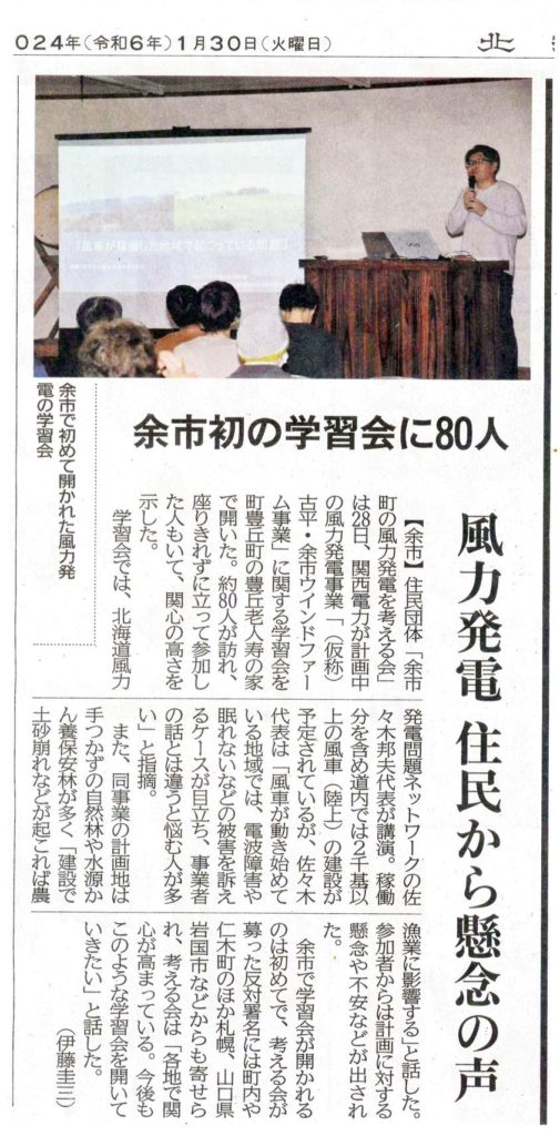 仁木町が外れた「古平・余市ウィンドファーム事業」が、昨年末に発表された。
