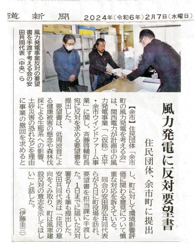 昨年末に結成された「余市町の風力発電を考える会」は、5日役場を訪ね、「(仮称)古平・余市ウィンドファ―ム事業」計画に反対する署名764筆と「要望書」を斎藤町長宛に提出した。