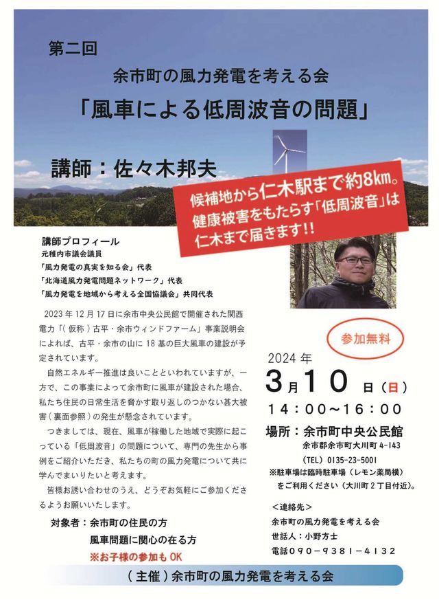 2024.03.05 「風車による低周波音の問題」講演会があります。 イベント 10日(日)、余市中央公民館です。 是非とも、ご参加くださいませ。 「日本自然保護協会」「北海道環境審議委員会」に、 「要望書」を提出します。 Tweet Share Hatena Pocket RSS feedly Pin it この記事のタイトルとURLをコピーする 三町長は、風車推進へ 前の記事 洋上風力発電に関する吉村美枝子山形県知事 記者会見(抜粋) 次の記事 niki-wind 仁木町の風力発電を考える会です。 一見エコと思われる風力発電ですが、住民の健康被害にもかかわる、とても多くの問題を抱えています。 いっしょに学んでいきましょう。 http://niki-wind.main.jp/