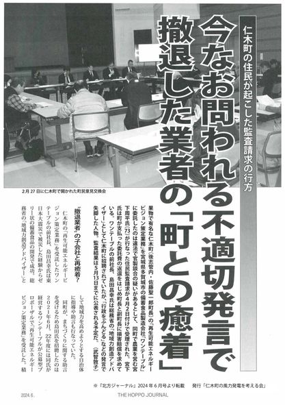 2024.05.21 北方ジャーナル6月号に、『住民監査請求』の事が掲載! 仁木の話題 Tweet Share Hatena Pocket RSS feedly Pin it この記事のタイトルとURLをコピーする 再エネ賦課金は廃止せよ!! 前の記事 おめでとう!!!【陸上風力発電の設置規制法が可決、成立】自衛隊レーダーへの影響を防止 次の記事 niki-wind 仁木町の風力発電を考える会です。 一見エコと思われる風力発電ですが、住民の健康被害にもかかわる、とても多くの問題を抱えています。 いっしょに学んでいきましょう。 http://niki-wind.main.jp/