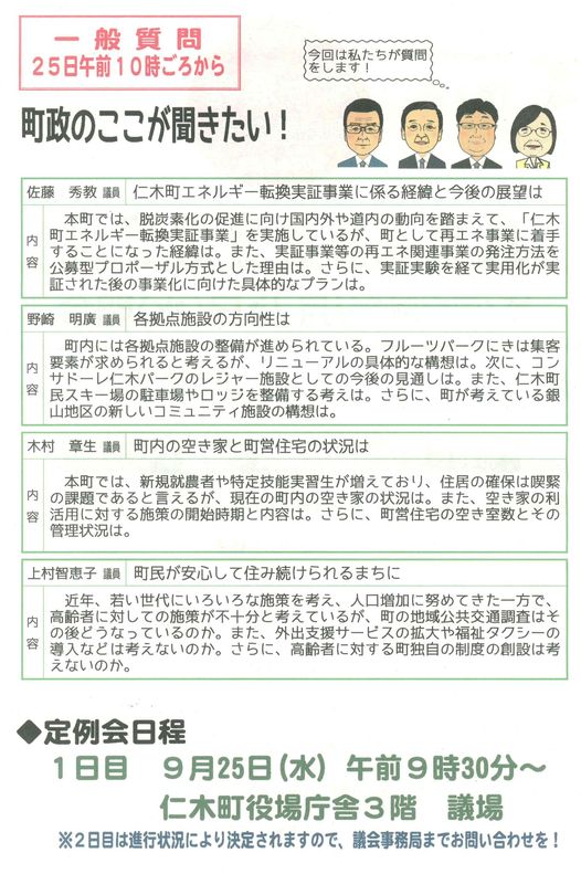 特に最初に、佐藤秀教議員の再エネ問題「仁木町エネルギー転換実証事業に係る経緯と今後の展望は」が注目されます。