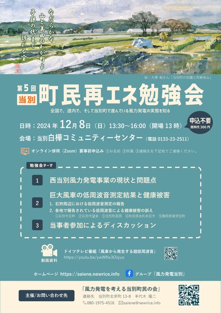 2024.11.25 第5回 当別町 町民再エネ勉強会 開催されます! 北海道の話題 巨大低周波音の測定結果と健康被害を発表します。当事者による話し合いが、興味深いです。 「風車から発生する超低周波音」のドイツTV番組が放映されます。 Tweet Share Hatena Pocket RSS feedly Pin it この記事のタイトルとURLをコピーする 無農薬リンゴの記事が、道新に載りました 前の記事 風車を考える会《余市・赤井川》の講演会があります 次の記事 niki-wind 仁木町の風力発電を考える会です。 一見エコと思われる風力発電ですが、住民の健康被害にもかかわる、とても多くの問題を抱えています。 いっしょに学んでいきましょう。 http://niki-wind.main.jp/