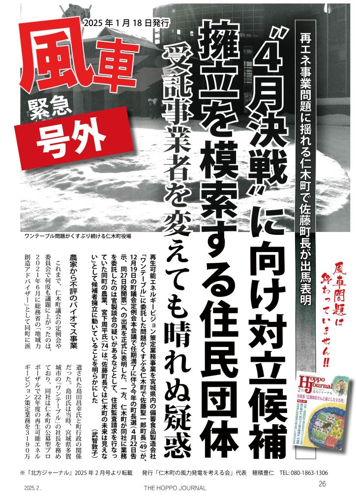2025.02.03 町長選4月決戦・・・・・・このまま?でイイのか、仁木町政 仁木の話題 今問われている議員の良識、町民の見識!! 誰が見ても、不正のオンパレード。 このままでは、全国民から町民自体の意識レベルが疑われても致し方ない。 Tweet Share Hatena Pocket RSS feedly Pin it この記事のタイトルとURLをコピーする 本当は怖い風力発電の真実 田鎖順太(北大工学研究院助教 … 前の記事 トランプ旋風か 洋上風力に大いなる翳(かげ)りが 次の記事 niki-wind 仁木町の風力発電を考える会です。 一見エコと思われる風力発電ですが、住民の健康被害にもかかわる、とても多くの問題を抱えています。 いっしょに学んでいきましょう。 http://niki-wind.main.jp/