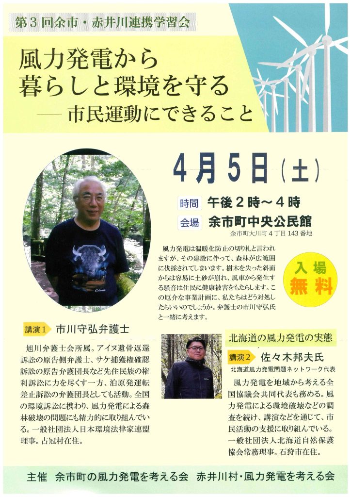 余市中央公民館で、市川弁護士をお招きしての風車反対の講演会があります。